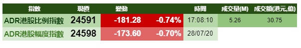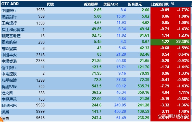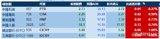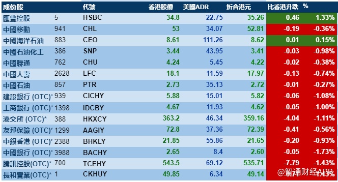 智通财经APP获悉,周二美国三大股指走弱,带动港股ADR指数下挫,按比例计算,收报24591点,跌181.28点或0.74%。大型蓝筹走势不一,汇丰控股收报35.26港元,较港收市涨0.46港元;腾讯控股收报535.71港元,较港收市跌7.79港元。