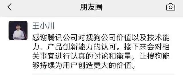 收购消息发酵后,王小川只在朋友圈做了简短回复:先表达对腾讯的感谢,紧跟一句“…会对相关事宜进行认真的讨论和权衡…”