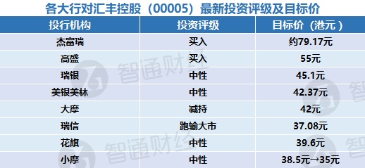 三、各大行对汇丰控股(00005)最新投资评级及目标价