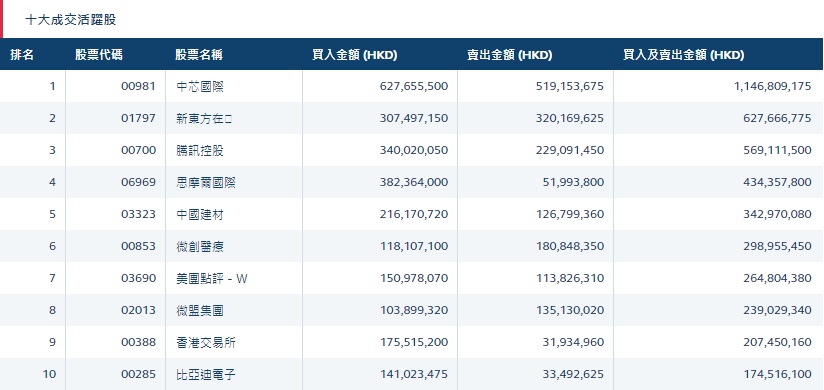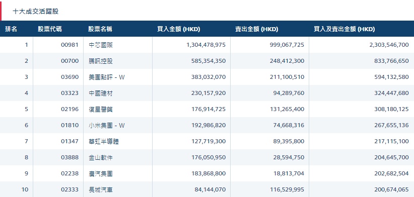 此外,思摩尔国际(06969)、小米集团-W(01810)、比亚迪电子(00285)分别获净买入3.3亿、1.18亿、1.07亿港元。而微创医疗(00853)、长城汽车(02333)分别遭净卖出6274万、3238万港元。