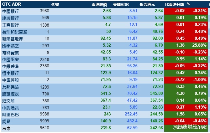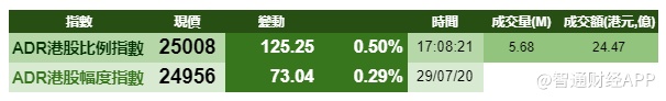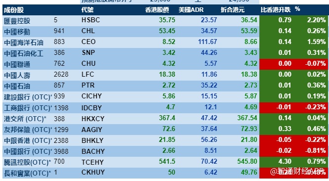 智通财经APP获悉,周三美股三大指数上涨,带动港股ADR指数上扬,按比例计算,收报25008点,涨125.25点或0.5%。