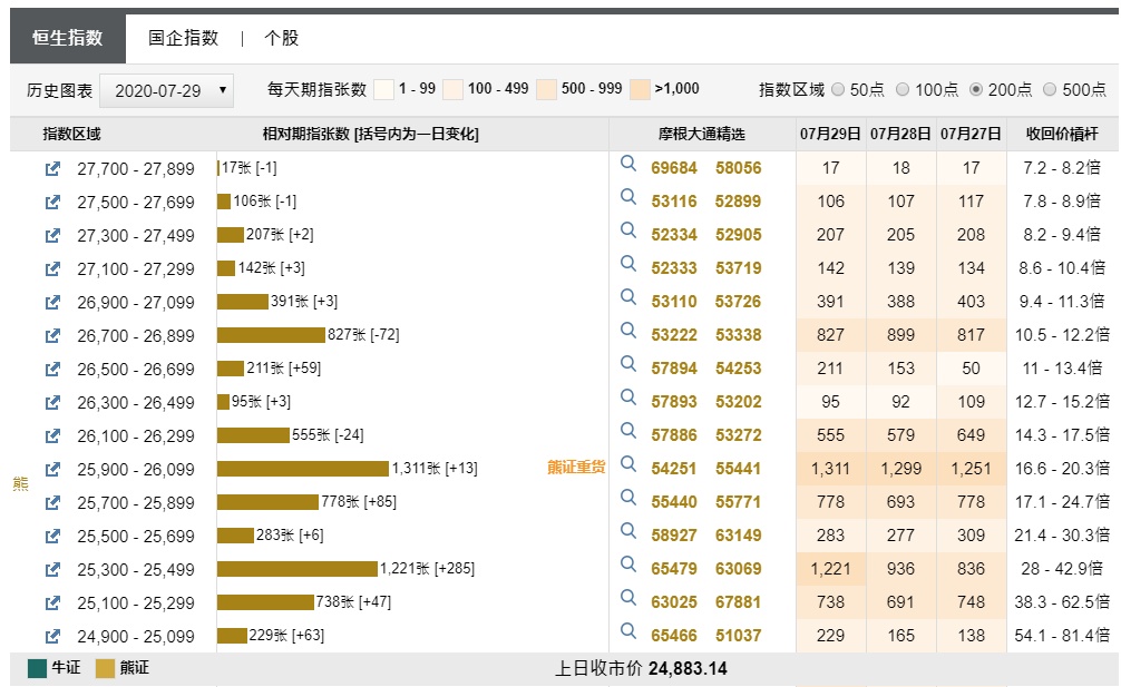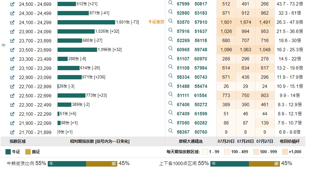 智通财经APP获悉,截至7月29日,恒指最新的牛熊街货比例55:45。摩根恒指牛熊证街货分布图中的数据显示,熊证街货重货区在25900-26099区间,该区间最新熊证数量为1311张,较上一交易日增加13张;最多新增区在25300-25499区间,该区间最新熊证数量为1221张,较上一交易日增加285张。牛证街货重货区在24100-24299区间,该区间最新牛证数量为1601张,较上一交易日减少73张;最多新增区在22900-23099区间,该区间最新牛证数量为671张,较上一交易日增加236张。