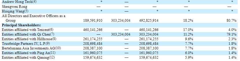 主要股东方面,腾讯相关实体持有公司17%的股份,投票权为4%。