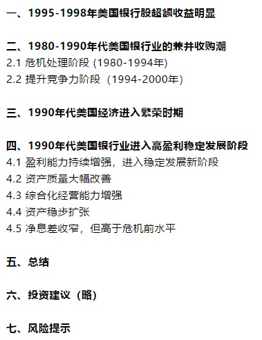 1990年代美国银行业经营环境复杂,美国银行业经历了历史上最大的兼并收购潮,美国银行监管制度在这一时期也出现了巨大的变革,不仅打破了长期以来的单一银行制度,而且从分业经营逐步走向混业经营。本报告主要聚焦美国银行业1990年代的经营环境和经营情况,分析为什么美国银行股在这一时期投资价值巨大。