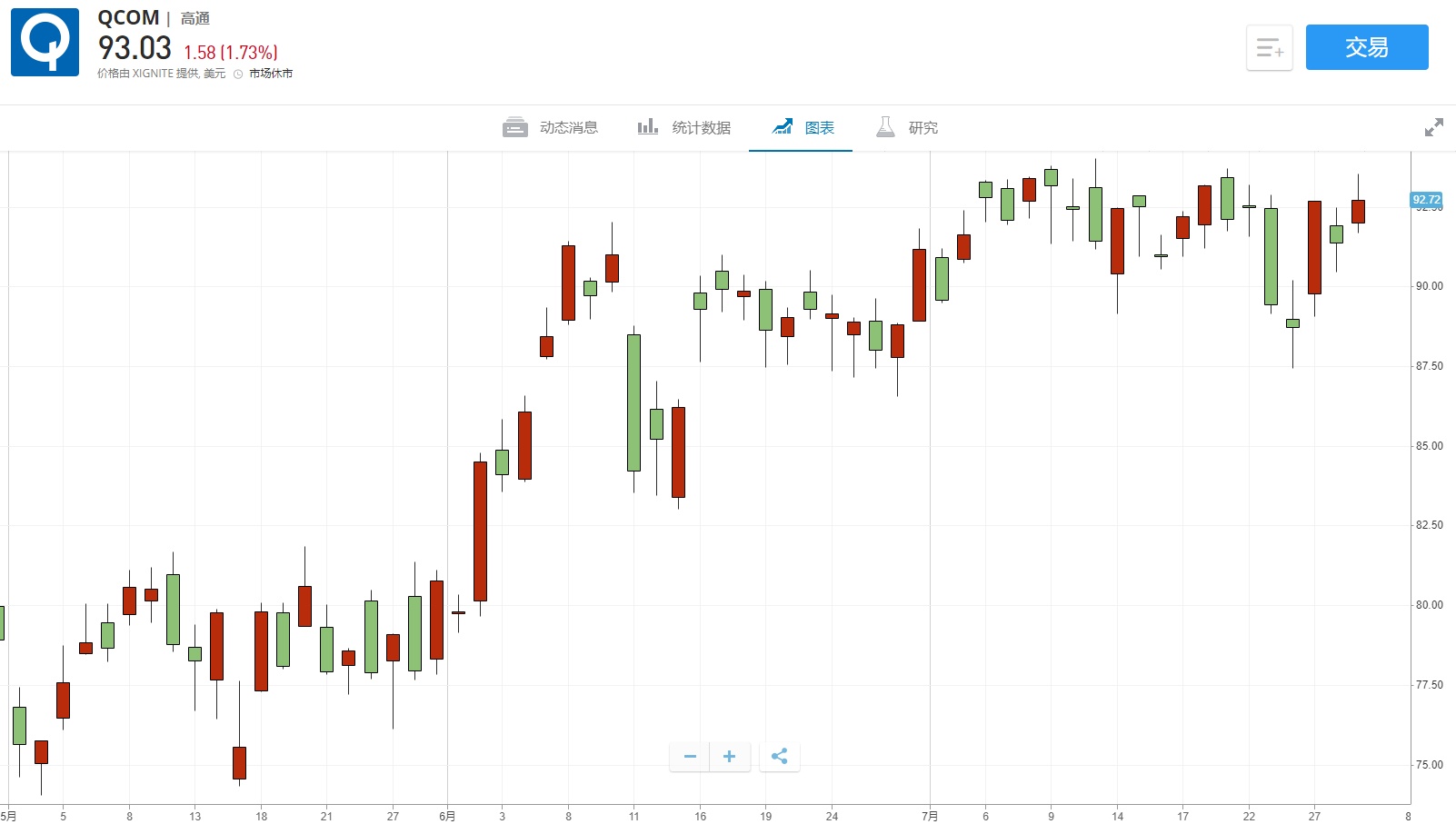 智通财经APP获悉,7月30日(周四)美股盘前,截至16:09,高通(QCOM.US)涨10.6%,报103美元。