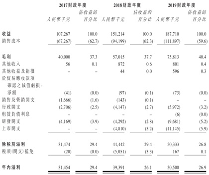 而净利润方面,公司2017-2019财年分别录得3145.4万元、3939.1万元及5050万元,呈现逐年增长态势。然而净利率方面,2017-2019年分别为29.4%、26.1%和26.9%,出现一点波动,不过2018年有营收占比3.2%的上市开支和3.3%所得税开支拖累,2019年研发开支营收占比由2018年的2.8%提升至5.2%,还有5.9%的上市开支影响,综合考虑上述因素,公司近年来的经营利润水平其实是有较为明显增长的。