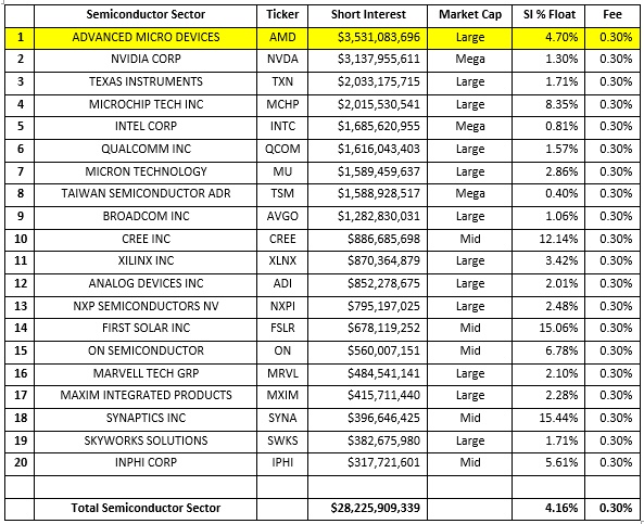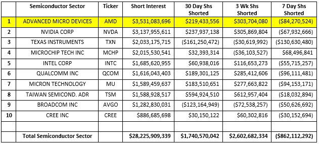 该消息公布后,AMD股价在午盘交易中上涨了14%以上。AMD的空头总额为35.3亿元,卖空4223万股,约占流通股的4.70%。在半导体行业中,AMD位于被做空规模首位。