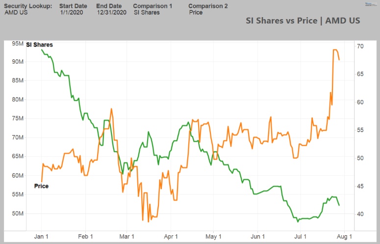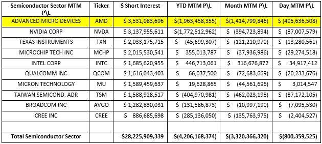 在AMD盈利的推动下,半导体行业相关个股当天(美东时间7月28日)上涨近3%,在午间交易中AMD领涨15%。按市值计算,空头在午盘交易中损失了8亿美元。按市值计算,周三(美东时间7月29日)AMD空头的损失为4.96亿美元,使年初至今的损失达到19.6亿美元。这些累积的损失和周三的突然打击可能会推动股票轧空,加速最近AMD空头回补的趋势。