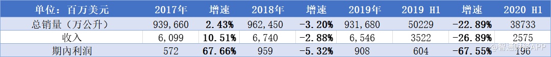 实际上,自啤酒行业经历市场整合期之后,全国啤酒销量便进入低速质增长期。据GlobalData 数据显示,2013-2018 年中国啤酒消费量 CAGR 为-2.0%。受行业周期影响,百威亚太于2019年收入便同比有所下降,而受公共卫生事件影响,啤酒行业于2020上半年尤其是夜生活渠道受到严重冲击,百威亚太上半年业绩则进一步遭到重创。