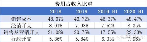 1.7%,净利率由2019年上半年17.15%下降至2020上半年的7.61%,达到近三年来最低水平。在费用率方面,公司销售成本、经销开支、行政开支及销售及营销开支占收入比重均达到历史高位。