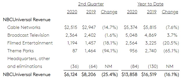 NBC环球(NBCUniversal)营收61.24亿美元,同比下降25.4%。其中,有线电视网路营收25.15亿美元,广播电视营收23.64亿美元,电影娱乐营收11.94亿美元,主题公园营收8700万美元。
