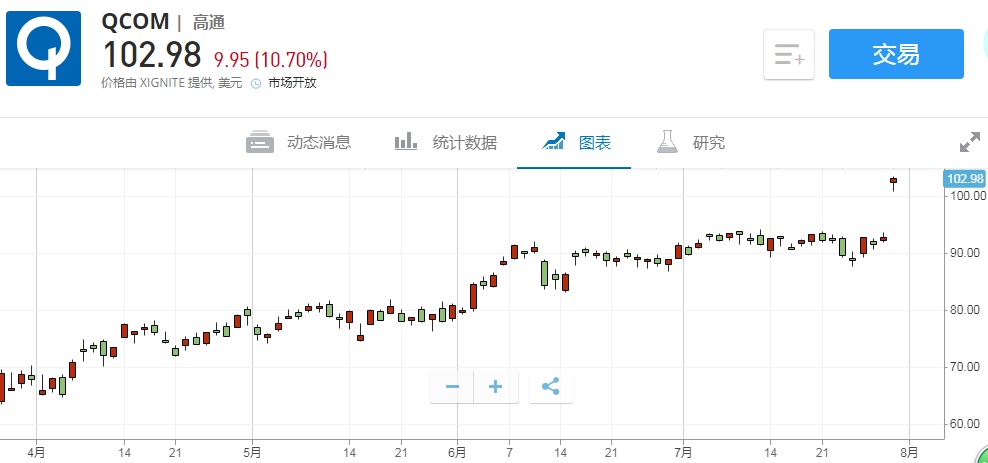 智通财经APP获悉,7月30日(周四)美股盘初,截至21:49,高通(QCOM.US)涨10.47%,报102.77美元。