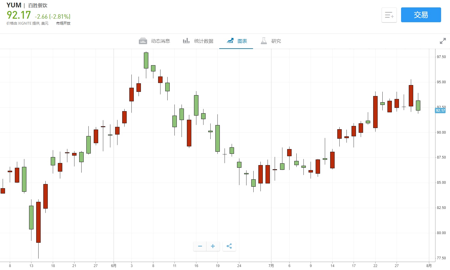 智通财经APP获悉,7月30日(周四)美股盘初,截至21:50,百胜餐饮(YUM.US)跌2.9%,报92.1美元。