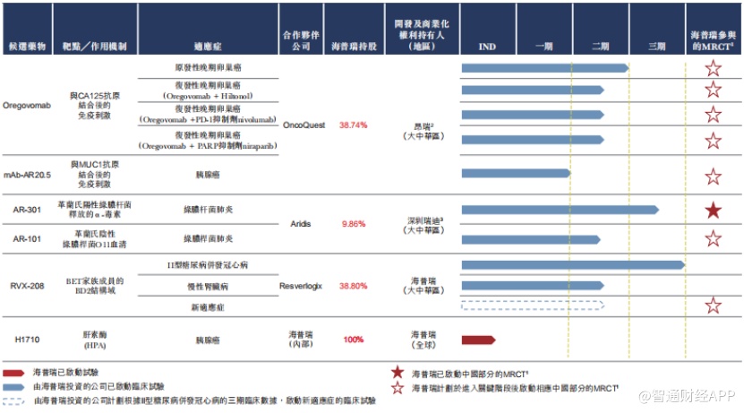 海普瑞的创新研发领域,拥有多个全球首创的创新产品,包括用于晚期原发性卵巢癌治疗的Oregovomab、用于金黄色葡萄球菌肺炎的AR-301、降低II型糖尿病人严重心血管事件发生率等的RVX-208,均处于全球III期临床研究评估阶段。