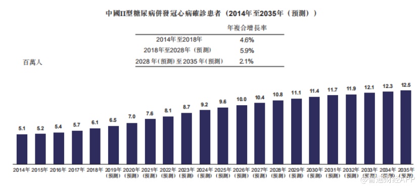 在适应症方面,RVX-208主要用于降低II型糖尿病、高危心血管疾病、急性冠状动脉综合征及低高密度脂蛋白(HDL)病人的主要不良心血管事件发生率。II型糖尿病并发冠心病在中国属于发病率较高的病种,2014-2018年,该病在中国地区的确诊患者从510万增至610万,并预计到2028年达到1080万,2035年达到1250万,其中2018-2028年确诊病患复合增长率达到5.9%。可见,RVX-208商业化后的市场发展潜力不容忽视。