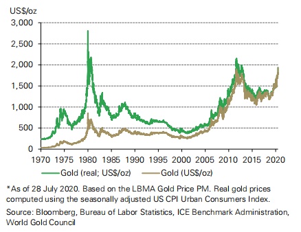 全球经济的走向尚未确定,各国央行一直在大幅降息,并制定大量政策和救助计划。这些举措加剧了人们的担忧,进而推动了股市反弹,但也致使通货膨胀率也不断上升。因此在高通胀率下,黄金实际价格仍低于最高纪录。