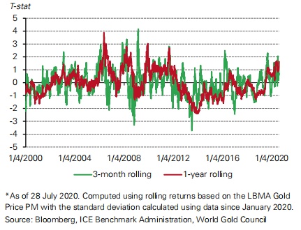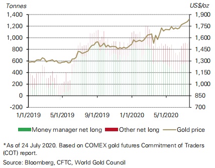 从历史上看,黄金的价格表现与黄金衍生品市场的定位存在正相关关系。然而,今年大部分时间,衍生品市场净多头头寸(通常与投机性交易活动有关)在金价上涨时却下跌。这在一定程度上是由于与公共卫生事件相关的黄金市场供应链混乱影响了市场。但是,今年迄今为止,黄金相关的ETF资金流入量却创下历史纪录。