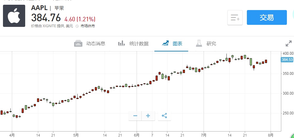 智通财经APP获悉,7月31日(周五)美股盘前,截至16:15,苹果(AAPL.US)涨6.05%,报408.40美元。