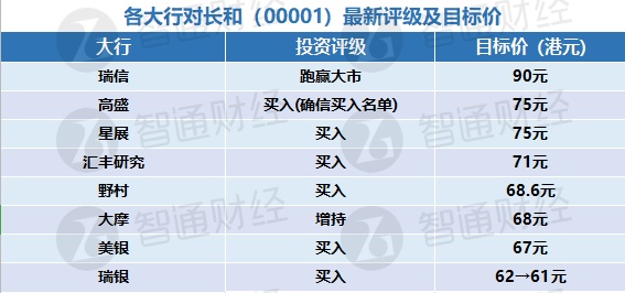 智通财经APP获悉,长和(00001)将于下周四(8月6日)公布截至半年期业绩,市场预计受公共卫生事件影响,将会对公司旗下零售、港口、能源业务造成冲击,但是公司旗下电讯及基建业务仍然稳固,目前预计长和今年上半年的普通股股东应占净利润介于132.26亿至134.61亿元之间,较2019年同期的182亿元,同比下滑26%至27.3%。以下为各大行对长和的最新投资评级以及目标价:
