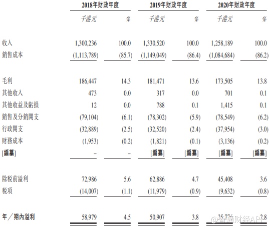 招股书显示,2018-2020财年内,公司的营收由13亿港元增长至13.3亿港元,又回落至12.58亿港元。看似营收规模很大,但实际上由于妙思身处行业中游,利润率却并不是很高。近三年来公司的年内溢利分别为5900万港元、5090万港元及3580万港元,在2020财年内骤降。