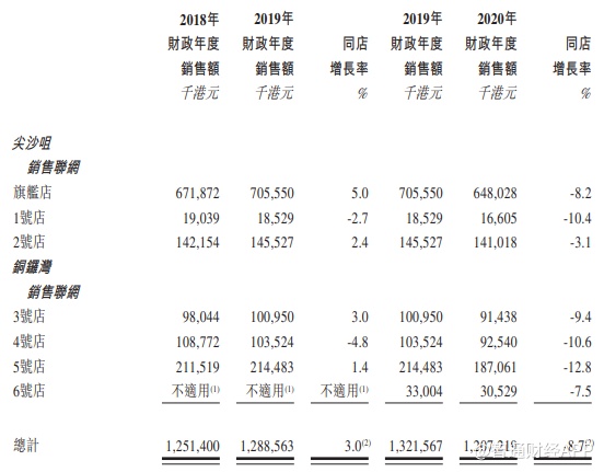 不过,也正因为大部分收入来自于游客,妙思亦深受香港零售业变动的影响。从公司的同店销售数据来看,由于社会事件、自2019年6月起旅客数目下降及公共卫生事件爆发对香港消费意欲造成不利影响,导致2020财年的整体同店销售较2019财年下降8.7%。基于所有店铺的同店增长率呈现负值,2019年销售额贡献7.05亿港元的旗舰店下滑8.2%至6.48亿港元。