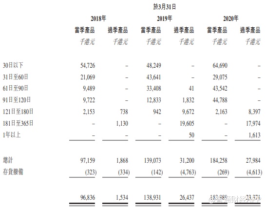 线下分销网络下滑严重之际,公司亦开始加大对存货拨备的计提,包括当季和国际产品,2018-2020财年的存货拨备结余分别为70万港元、490万港元及490万港元。