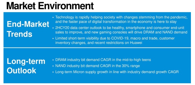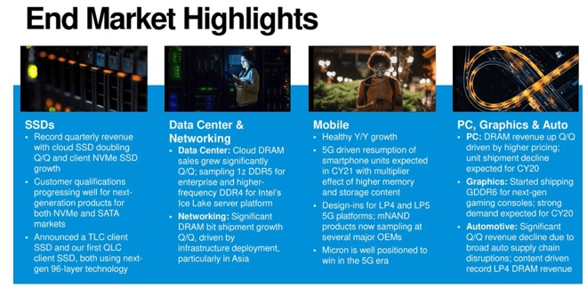 在2020年剩下的时间里,美光科技还看到了来自游戏机的强劲需求。据有关媒体报道,传闻索尼(SNE.US)计划生产新一代PlayStation游戏机。由于大流行,预计索尼在2020年的游戏机销量将增长近一倍。尽管这些计划在美光科技的业务中所占比例不是很大,但这仍将有助于提高公司在内存和存储解决方案方面的定价能力。