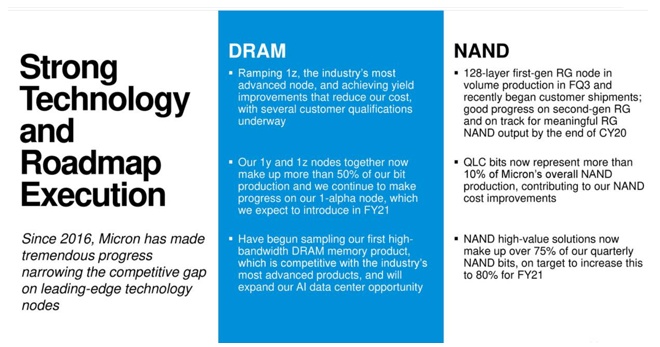 美光科技一直致力于在DRAM和NAND空间领域引入高价值创新,以改善产品组合,减少与内存商品化相关的定价影响。