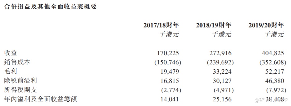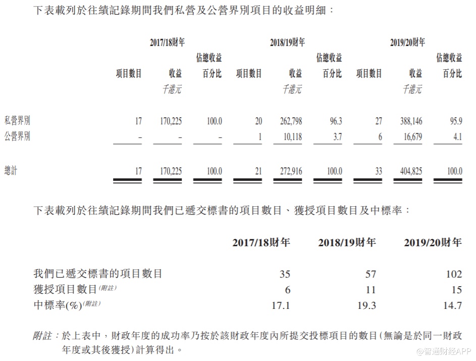 招股书显示,公司的收益由2017/18财年的约1.7亿港元增至2018/19财年的约2.729亿港元,并进一步增加至2019/20财年约4.048亿港元。公司于往绩记录期间内的收益增加主要是由于(i)财政年度期间确认收益的项目数量由2017/18财年的17个增至2018/19财年的21个及2019/20财年的33个;(ii)财政年度内收益贡献超过5000万港元的项目数目从2017/18财年的零个项目增加至 2018/19财年的一个项目,并进一步增加至2019/20财年的三个。