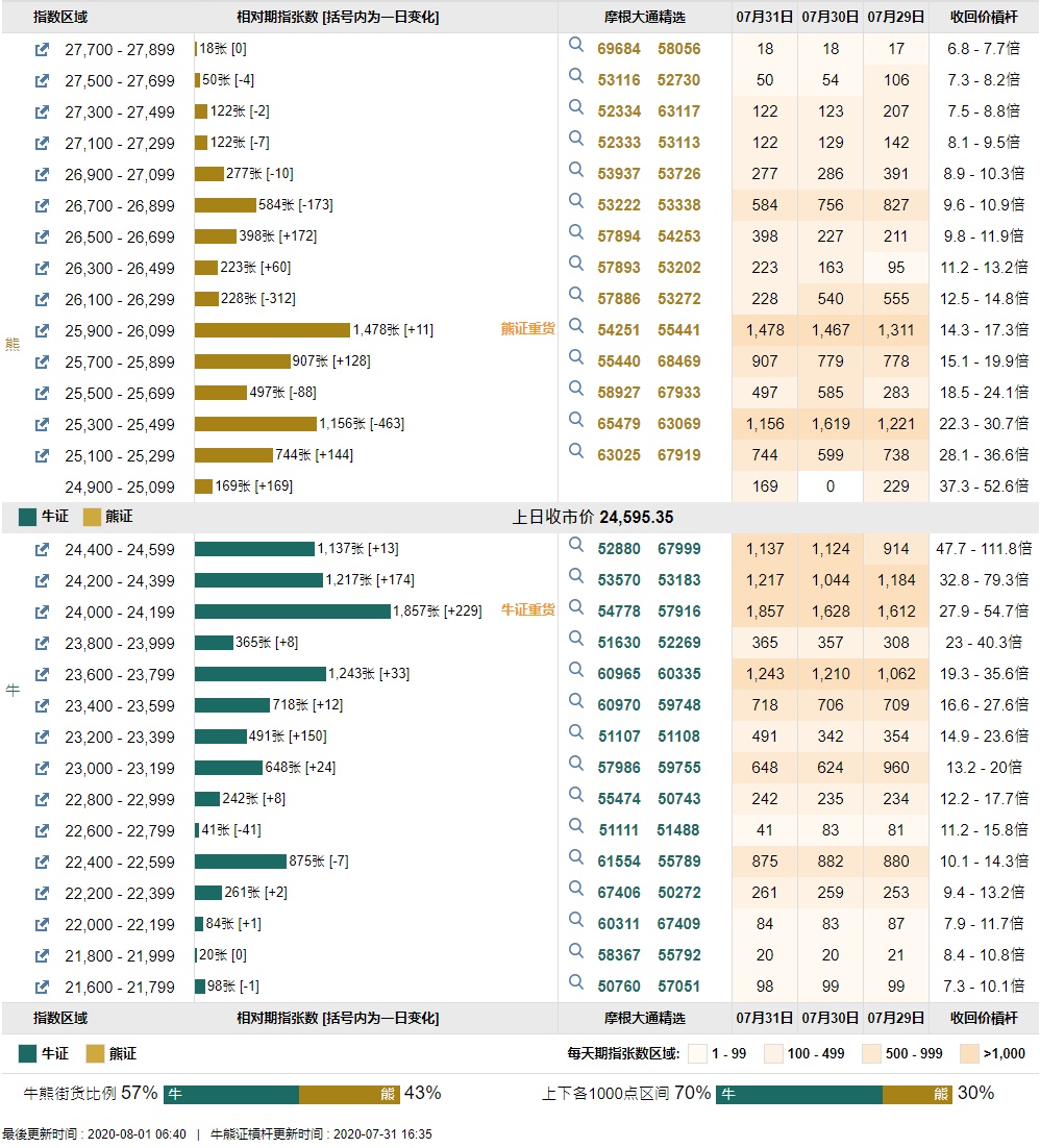 智通财经APP获悉,截至8月1日,恒指最新的牛熊街货比例57:43。摩根恒指牛熊证街货分布图中的数据显示,熊证街货重货区在25900-26099区间,该区间最新熊证数量为1478张,较上一交易日增加11张;最多新增区在26500-26699区间,该区间最新熊证数量为398张,较上一交易日增加172张。牛证街货重货区在24000-24199区间,该区间最新牛证数量为1857张,较上一交易日增加229张;最多新增区也在该区间。