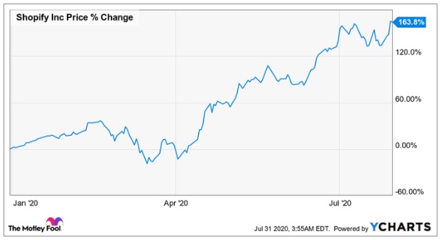 由于强劲的业务执行力和卫生事件导致的需求激增,Shopify的股票今年一直在飙升。它目前的市值约为1240亿美元。