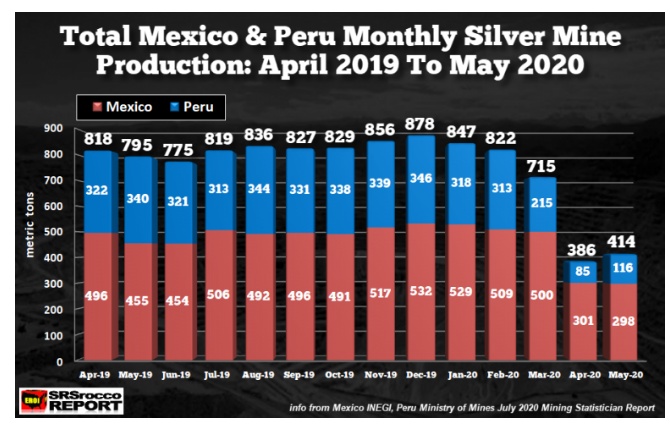 过去三个月(3月至5月),墨西哥和秘鲁的白银产量净减少770吨。仅这两个国家就减少了近2500万盎司的白银产量。如果考虑到其他国家,那么到目前为止,白银产量可能已下降超过3500-4000万盎司。