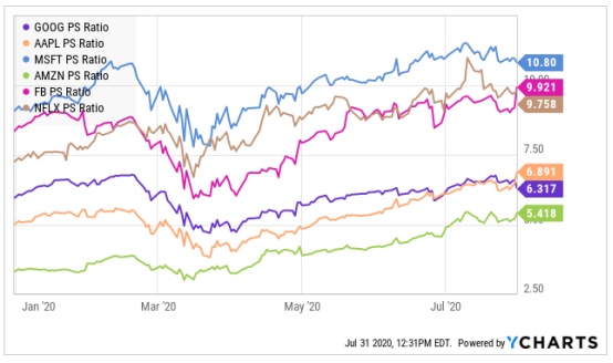 从PS值来看,亚马逊目前的PS值仅有5.4倍,是同行中最低的。远期PS值甚至更低,只有4.5倍。而亚马逊的营收增幅速度却是同类企业中最快的。