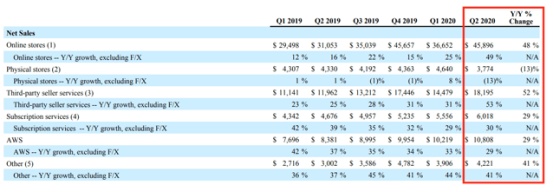 卫生事件的爆发也推动了亚马逊在线商店和第三方卖家服务的营收拥有异常高的增幅。在这种情况下,该公司二季度的在线销售额较去年同期增长两倍。