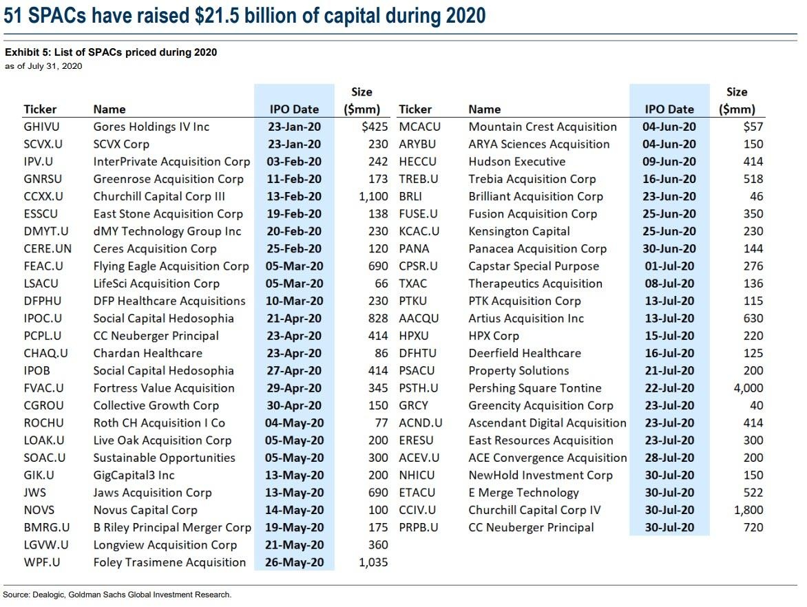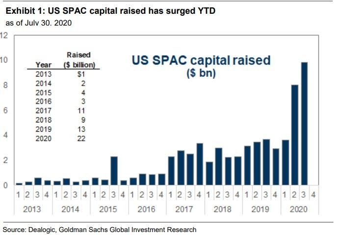 上一次SPAC激增的情况发生在2007年。而2008年SPAC泡沫与其他住房信贷泡沫一起破灭,但现在已慢慢恢复,正如高盛分析师David Kostin所表示,SPAC的募资额逐年飙升。