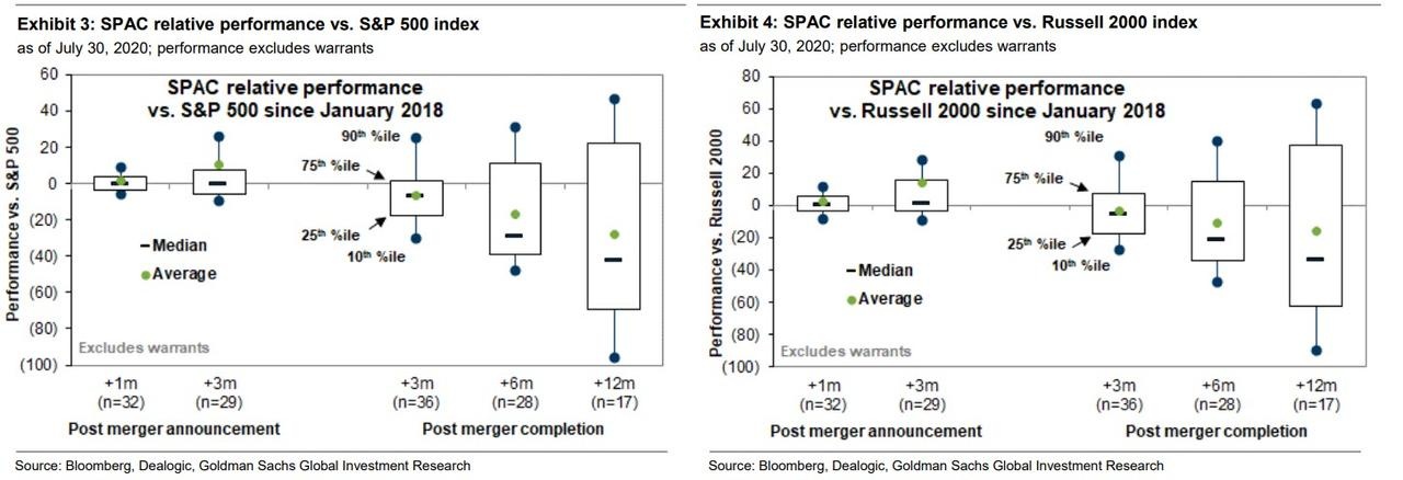 如上图所示,业绩分布极为悬殊,第75百分位的SPAC表现较标普500指数高出22%,而第25百分位的交易则落后69%。与罗素2000指数的可比回报率从+37%到-63%。