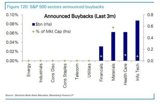 正如摩根大通分析师David Lebovitz表示,股票回购“并非到处都在发生”,而是“受到特定行业和股票的推动”。他补充说,金融和材料类企业可能更愿意在经济低迷时期进行回购,因为自3月份股价触底以来,该类股票涨幅没有展现出较高水平。