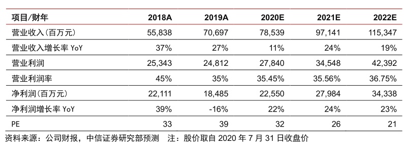 盈利预测:公司广告业务开始进入逐步复苏阶段,同时公司中长期的成长性依旧较好,公司亦拥有充足的自由现金流与在手现金,料将提升公司的抗风险能力以及并购投资能力。考虑到其广告业务的良好表现,我们略微修正对公司的盈利预测,预计2020-2022对应收入785/971/1153亿美元(原预测726/933/1130亿美元),净利润226/280/343亿美元(原预测220/280/336亿美元),当前股价对应PE估值为32/26/21x,公司依旧是互联网领域优质的投资标的之一。