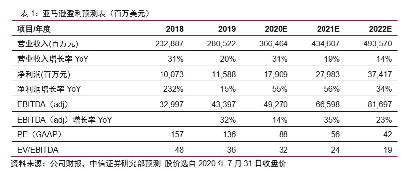 盈利预测:基于公司二季度的业绩以及积极展望,中信证券调整公司盈利预测,预计2020-2022公司收入3665/4346/4936亿美元(原预测3306/4067/4720亿美元),净利润为179/280/374亿美元,EBITDA(adj)为493/666/817亿美元(原预测分别为103/278/384亿美元、402/665/830亿美元)。作为本次卫生事件的主要受益者之一,公司长期将持续受益于零售线上化,以及企业向云端持续迁移等,公司当股价对应2020/21/22年EV/EBITDA为32/24/19X,长周期配置价值依然明显。