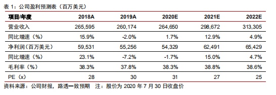 投资建议:根据当前路透一致预期,公司 2020/21/22 净利润预计为 543/625/654 亿美 元,当前股价对应 2020/21/22 PE 为 31/27/25X。由于 Q3 业绩显著超预期,后续一致 预期料将有所上调。短期而言,公司业绩不确定性仍然存在;但中期来看,受益于公司 优质的产品组合以及 5G 背景下的换机周期将至,苹果明年销售大年依旧可期。