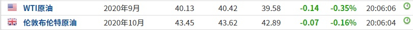 截至发稿,WTI原油跌0.35%,报40.13美元/桶。布伦特原油跌0.16%,报43.45美元/桶。