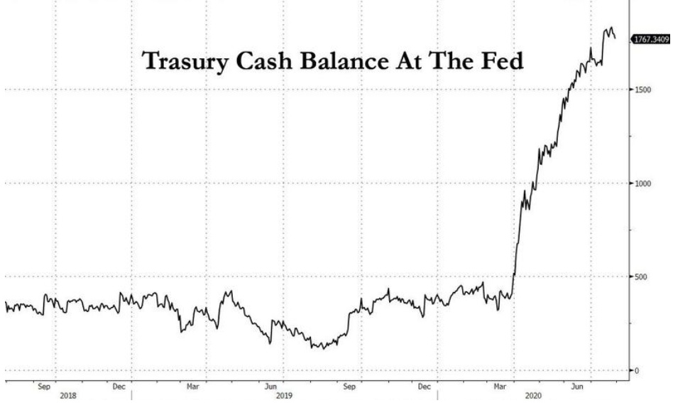 债券发行的大规模激增还会导致财政部现金余额大幅增加,这些现金余额将用于为各种财政刺激计划提供前期资金。下面的图表显示了美国财政部现金余额从3月底的4000亿美元激增到1.7万亿美元,创历史新高,而一旦国会批准,这笔钱就会马上花掉。