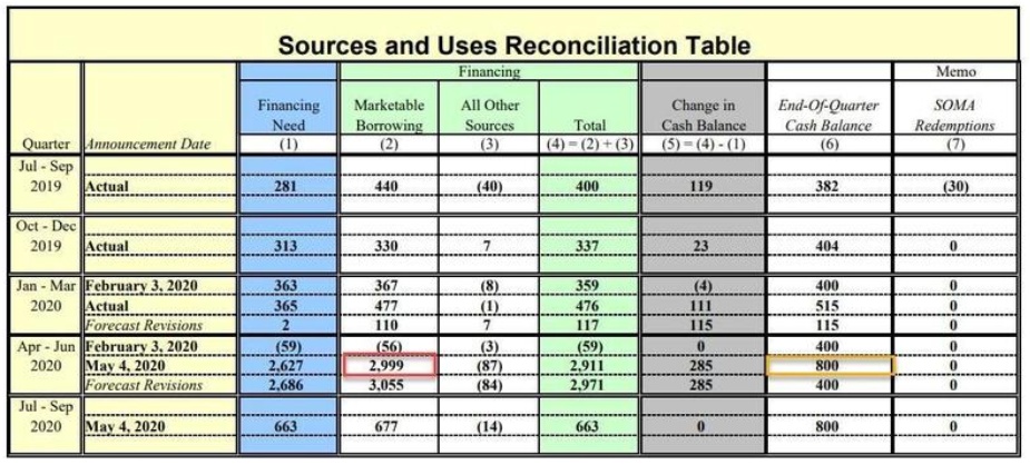 在5月4日发布的当时最新的可流通借款估算中,美国财政部震惊了市场,因为它宣布在4月到6月这个季度将借入2.999万亿美元,远远高于其在2月份做出的预测,当时美国财政部预计债务将减少560亿美元。尽管预计的债务数字震惊了市场,但这几乎没有反映在美国国债的价格或收益率上,原因很简单:就在前几周推出无限量化宽松政策时,美联储宣布将把为美国发行的所有总债务货币化。