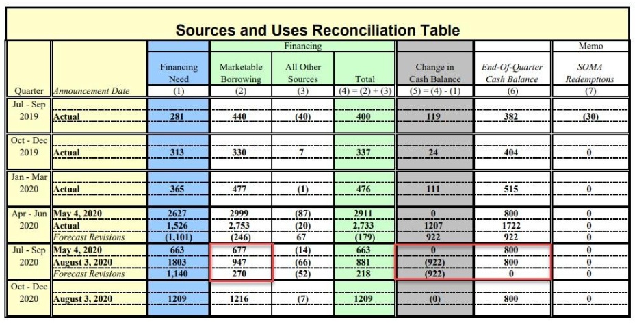 其次,这意味着在第三季度和第四季度,财政部将花费近3万亿美元,包括:截至9月30日的季度,现金从17220亿美元减少8000亿美元至9220亿美元,另外在该季度发行9470亿美元新债;截至12月31日的季度新债发行规模为1216亿美元。即通过支出现金或举债筹集总计3.085万亿美元的新资金。
