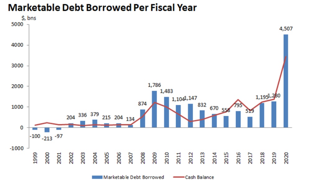 根据财政部的说法,“这些估计假设了1万亿美元的额外借款需求,以应对公共卫生事件的爆发。”