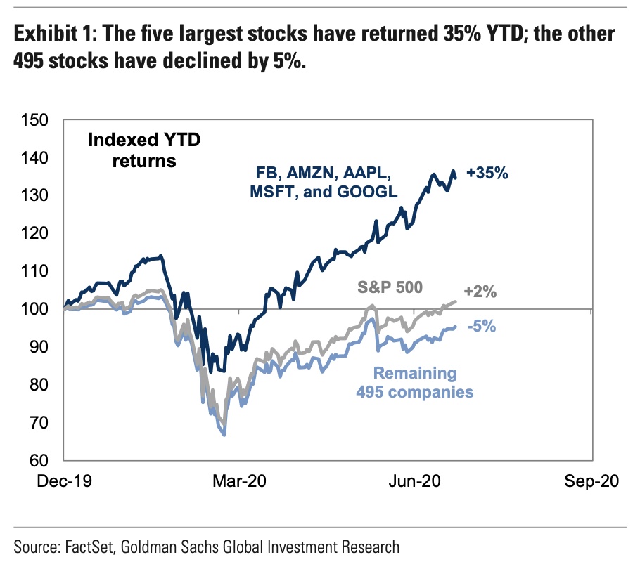 威尔逊强调的另一个问题也是4月底高盛首席经济学家David Kostin所指出的问题。高盛警告称,几乎所有的市场涨幅都来自于少数几只股票,即微软(MSFT.US)、苹果(AAPL.US)、亚马逊(AMZN.US)、Alphabet(GOOGL.US)和Facebook(FB.US)这五只科技股,这些股票自年初以来已经飙升了35%以上,而市场的其他股票仍然处于亏损状态。