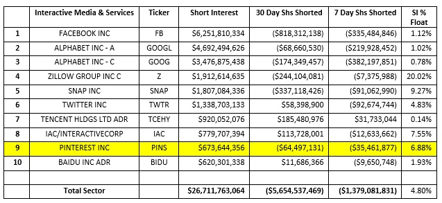 该股的空头总额为6.74亿美元,卖空2674万股,占流通股的6.88%。PINS是互动媒体及服务行业第九大空头。