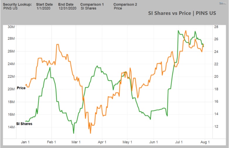按市值计算,PINS空头年初至今的损失为3.75亿美元,美东时间7月31日的损失为2.07亿美元。此次股价上涨造成的巨额亏损可能会导致轧空,推高PINS股价。如果卖空该股的数量跌至2200万至2300万股的水平,那么近期一半的卖空交易将出现震荡。如果PINS继续上涨,空头回补可能会令已卖空的股票跌至1600万股的近期低点。