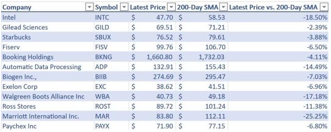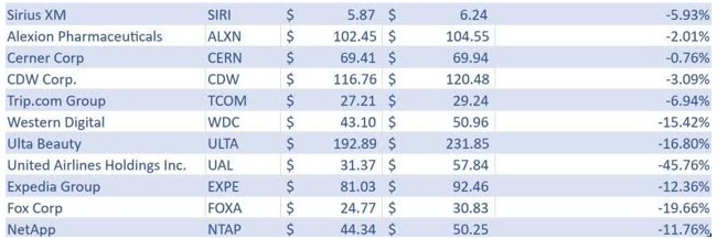 在纳指100ETF股价低于200日均线的23家公司中,由于公共卫生事件的影响,罗斯百货(ROST.US)、Ulta(ULTA.US)和沃尔格林联合博姿(WBA.US)等公司面临的零售环境十分严峻。由于同样的原因,旅游相关股票——Booking(BKNG.US)、Expedia(EXPE.US)、美联航(UAL.US)和万豪酒店(MAR.US)等也受到了沉重打击。