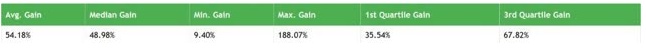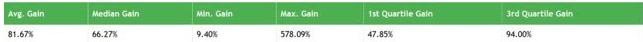 标普100指数较52周低点的涨幅中值(截至2020年8月2日)